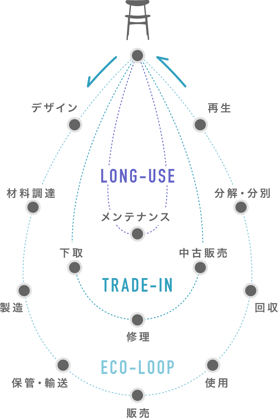 それは、1) 家具をずっと使い続けるための修理やメンテナンスサービス。2) ご家族構成の変化やお引越しなどでやむなく家具を手放される際の下取りによるサポート。3)古くなったり壊れてしまった家具の100%リサイクルです。特に木の部分は再び家具の材料に再生されるルートを構築しています。愛されてきた家具を無駄にはしません。